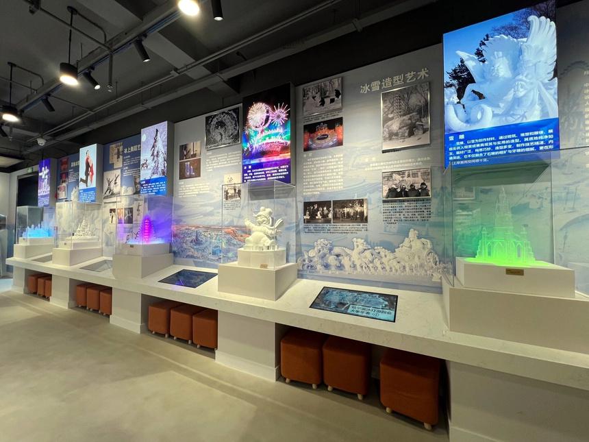 哈尔滨是中国著名的冰城,百年求索,岁月凝华。在冰雪艺术展示区域,以图文形式将哈尔滨冰雪艺术的发展历程娓娓道来。从早期的冰上舞蹈艺术再到冰版画、冰花瓷、冰灯、雪塑,到如今在国际上声名远扬的冰雪大世界、太阳岛雪博会等这些大型冰雪景观的打造,让哈尔滨冰雪艺术在不断创新中走向世界。文字中记载着哈尔滨冰雪文化故事,讲述着冰雪艺术家们的创作故事,让游客们深刻理解到冰雪艺术背后蕴含的城市精神与文化内涵。