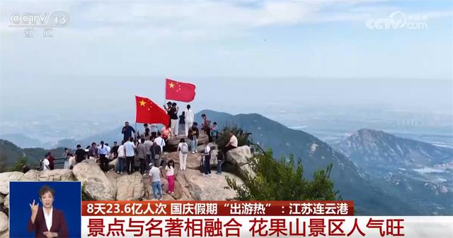 沿着蜿蜒山路,游客们拾级而上,走进“水帘洞”登上“玉女峰”,感受蓝天如洗、白云舒展的豪迈。不少游客还在山顶挥舞国旗,庆祝共和国生日。花果山景区将景点与名著深度融合,为游客准备了取材自《西游记》精彩片段的情景演出,分布在游客上山的途中,精彩节目轮番登场,为游客营造出热闹喜庆氛围。