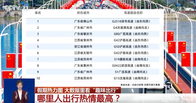 您知道哪里的人出行热情高吗?有网友说,聪明人都提前出门了。高德交通大数据显示,10月1日0点至10点,全国十大繁忙出程高速路段中,长三角与粤港澳大湾区各占一半。其中,广东的高速、火车站、机场等繁忙程度全面领跑全国。同时段全国十大繁忙高速服务区中,广东占8席,江苏占2席,广东人的长假出门热情领跑全国。