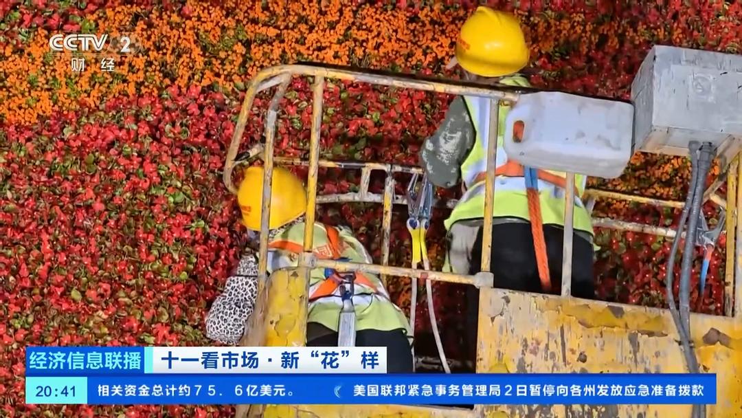 总台央视记者 王闻聪:今年,在花坛的底部布置了一个直径达45米的向日葵图案,寓意朵朵葵花向太阳。这里面的花没有那么大,但是,有两种具有自主知识产权的花,分别是一串红“奇迹”和小菊“绚秋星光”。他们是经过了近10年时间,杂交选育得到的新优品种,这两种植物都是已经能够大面积应用在园林绿化上的品种,在大花篮的花坛应用总量近3万株。