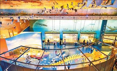 10月2日,游客来到位于江苏盐城的黄海湿地博物馆参观游览。