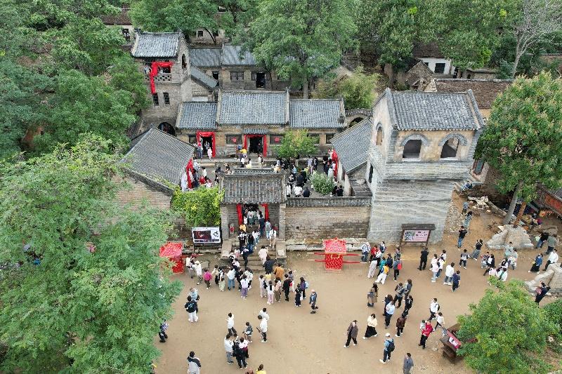10月3日,在山东省沂南县马牧池乡常山庄村的山东红嫂家乡旅游区,游客在热播剧《生万物》取景地打卡(无人机照片)。