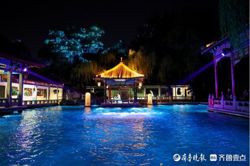 天下第一泉风景区白雪楼戏台轮番上演山东大鼓、山东快书、京韵大鼓等精彩节目,传统曲艺与超能说唱新潮碰撞,赢得游人阵阵喝彩。