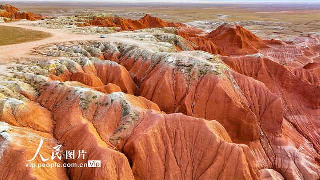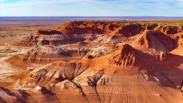 红崖台地位于内蒙古乌兰察布市四子王旗北部,山体呈现红色,随季节变化深浅交替,为典型的丹霞地貌,南北长约15公里,东西宽约10公里,当地人称“大红山”,是四子王旗国家地质公园的重要组成部分。金秋时节,红崖台地在秋风的浸染下色彩浓烈,景色壮丽,吸引游客纷至沓来。王正摄(人民图片网)