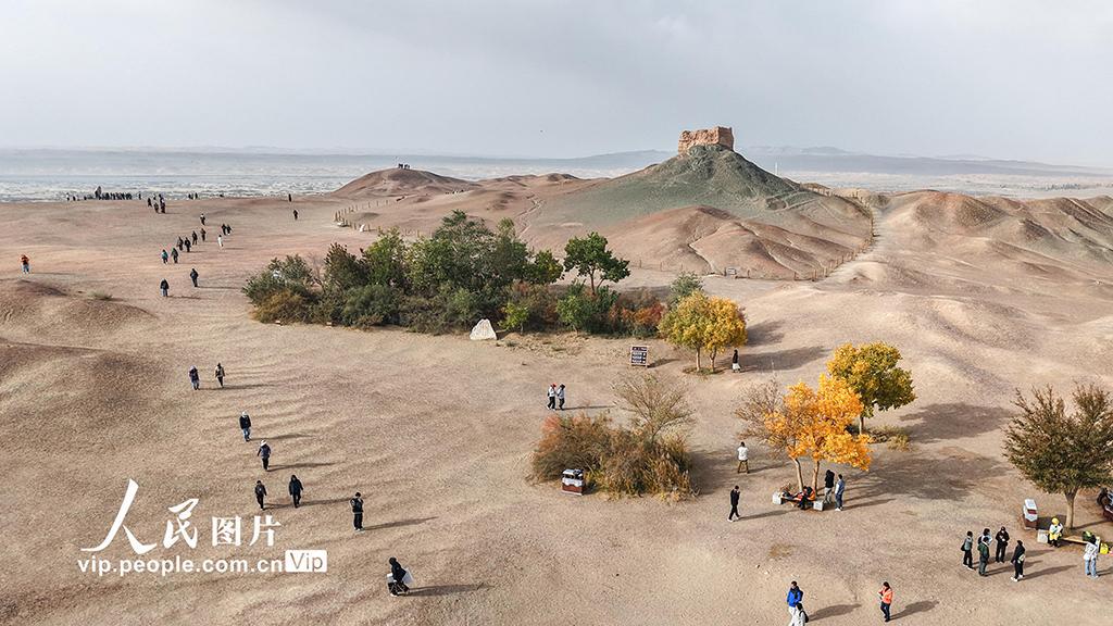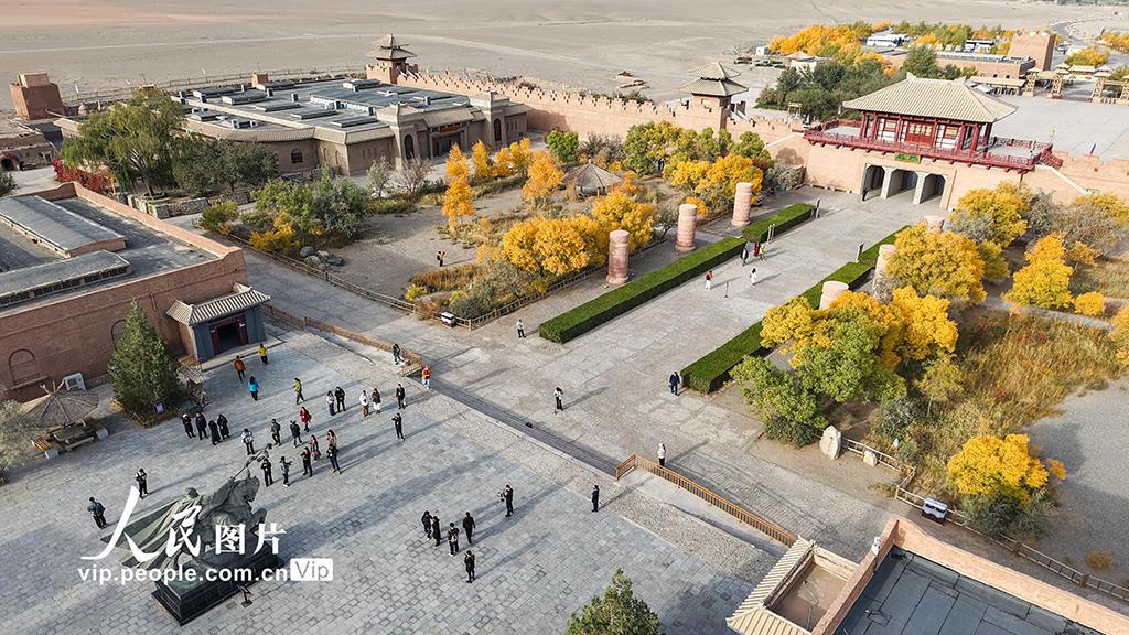 2025年10月14日,甘肃省敦煌市阳关景区秋意渐浓,金黄胡杨与沧桑烽燧、广袤戈壁、古朴博物馆建筑相映成景,吸引游客纷至沓来。陈坤摄(人民图片网)