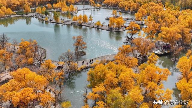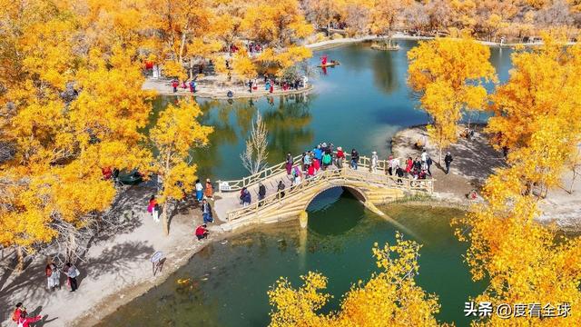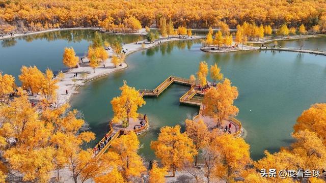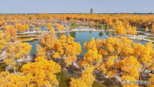更让人惊喜的是,金塔沙漠胡杨林还是西北少见的 “滨水型” 胡杨林。景区内依托黑河水源,形成了多处湖泊与湿地,清澈的湖水与金黄的胡杨交相辉映,构成了一幅绝美的山水画卷。湖边的胡杨树,将自己的身影倒映在水中,时而随着水波轻轻晃动,时而静止不动,宛如一幅动态的油画。游客们可以沿着湖边的栈道漫步,一边欣赏金黄的胡杨,一边感受湖水的清凉,偶尔还能看到几只水鸟在湖面嬉戏,为这幅画卷增添了几分生机与活力。若是运气好,遇到晴朗的天气,蓝天白云倒映在湖水中,与金黄的胡杨、清澈的湖水构成了一幅色彩丰富、层次分明的美景,随手一拍都是大片,让每一位游客都忍不住拿出手机或相机,记录下这难忘的瞬间。
