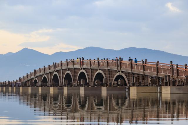 七孔浮桥观景、拍照:西望西山“睡美人”,东眺昆明主城天际线,湖光山色尽收眼底。日出时桥体剪影与滇池晨雾交织,黄昏时夕阳镀金桥身,夜景灯光倒影尤其浪漫。