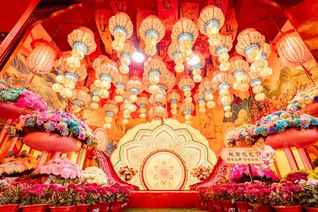 除了室内的八座主题展馆,园内还有月阁飞虹、虹彩童境、千福流朱、星宇巡航等多个室外主题布展,并与园内灯笼完美结合,有着白天、夜晚两种不同的赏菊体验。