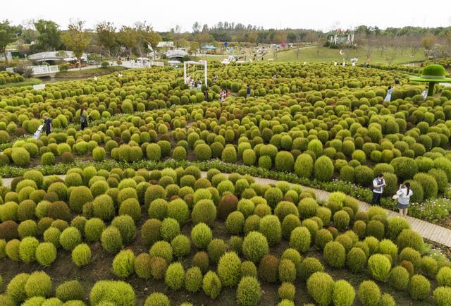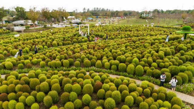 园内如烟似雾的格桑花海,在微风中漾起柔粉与纯白的波浪,成为镜头追逐的焦点。大片地肤绿意渐褪,边缘已悄然晕开一抹绯红。翩翩起舞的醉蝶花颤动着粉紫色花穗,与百日草等秋花共同编织专属季节的浪漫。
