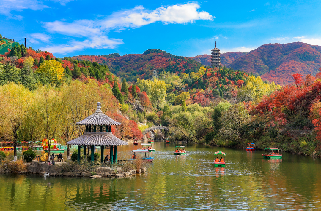 置身谷中,目之所及皆是浓烈的红,黄栌树木紧密相依,枝叶交错间,红色叶片层层叠叠,整片山林如同被点燃,热烈而绚烂。阳光穿过枝叶间隙,在地面投下斑驳的红色光影,漫步园中,伸手便可触碰满枝“火焰”,绚秋湖畔红叶倒映水中,红与绿、光与影交相辉映,不少游客驻足溪边,以满枝红叶为背景拍照,定格这份秋日美好。