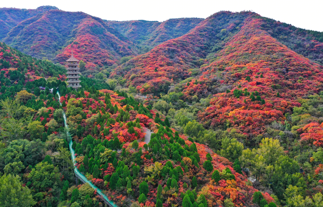 金秋十月末,济南红叶谷迎来红叶巅峰,4000余亩黄栌已全部换上盛装,深红似火、艳红如霞,将山谷铺成一片无边无际的红色海洋。