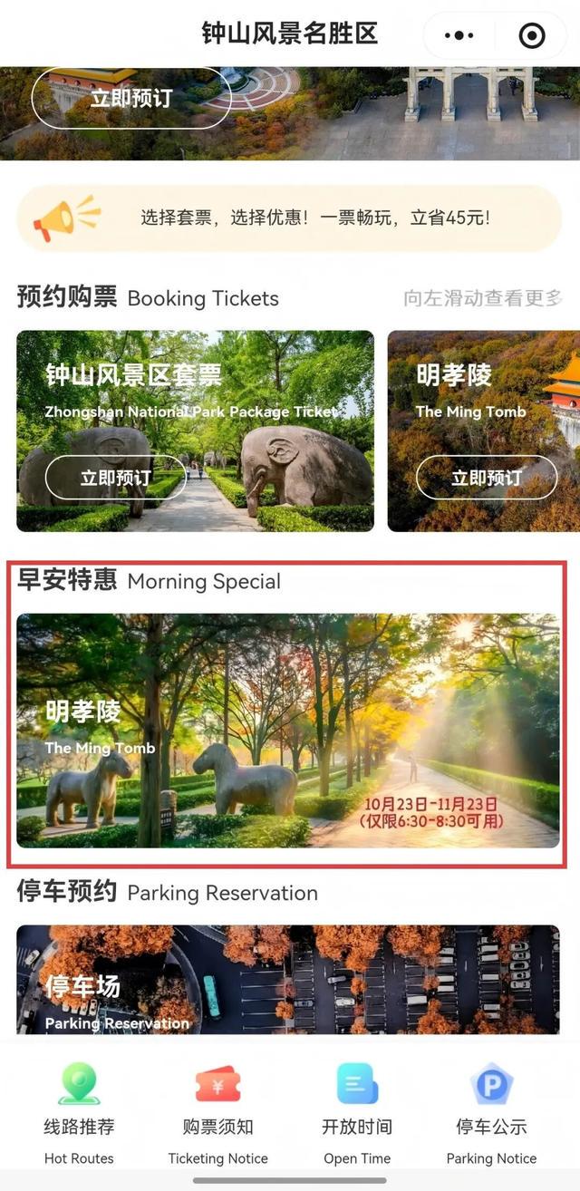 微信搜索“钟山风景区”小程序,直接购买“明孝陵景区早安特惠票”,享受明孝陵景区半价优惠35元/人(原价70元/人)。