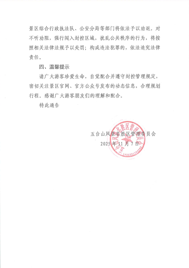 11月7日,五台山风景名胜区管理委员会发出《关于对五台山景区台顶及周边区域实施限期封控管理的通告》,通告称,因近日五台山景区普降雨雪,气温骤降,五座台顶区域进入严寒阶段。经五台山党工委、管委会研究决定,对五座台顶及周边区域实施限期封控管理。封控期限为:2025年11月8日至2026年4月30日。