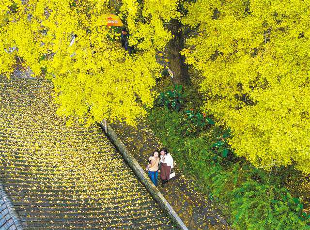 11月8日,游客在南川区德隆镇银杏村拍照打卡(无人机照片)。