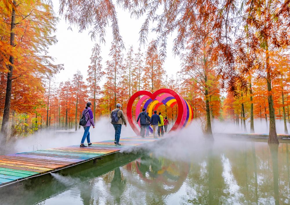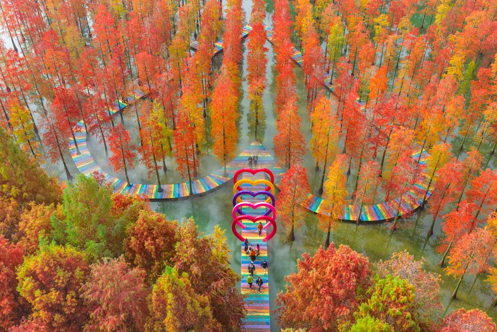 ↑2025年11月9日,游客在江苏泗洪洪泽湖湿地景区水杉林中游览。(无人机照片)CICPHOTO/张连华 摄